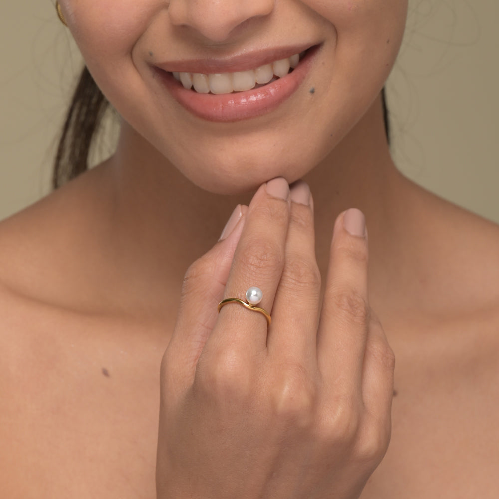 Let the "Dainty Floating Pearl" Gold Ring Design take center stage by wearing it on its own, drawing attention to its exquisite pearl and delicate band, ideal for those who adore rings for women gold.
