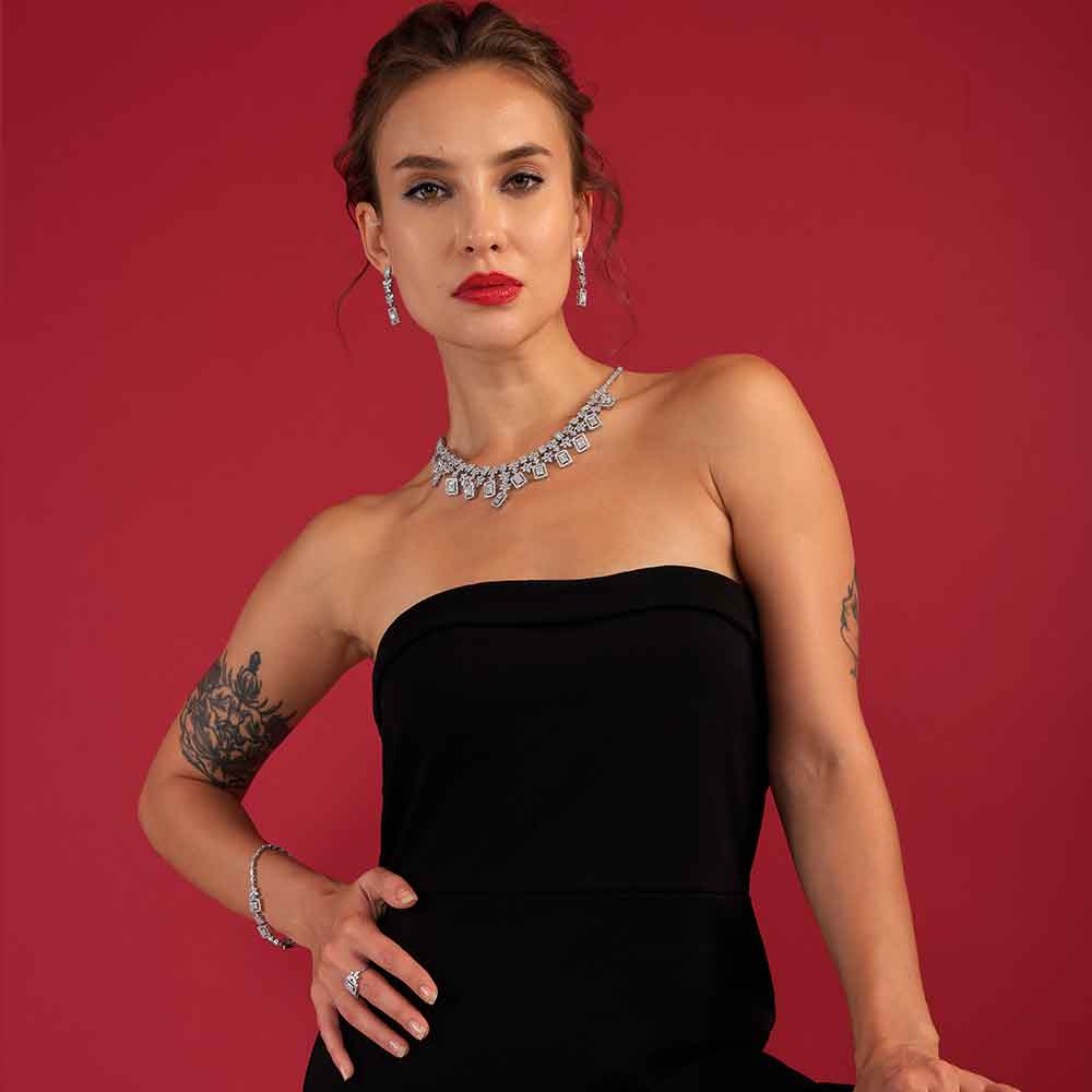 Diamond set filled with love for diamonds includes necklace, earrings, ring and bracelet. You can never go wrong with this diamond studded Necklace set and its the perfect choice for gift giving too.
